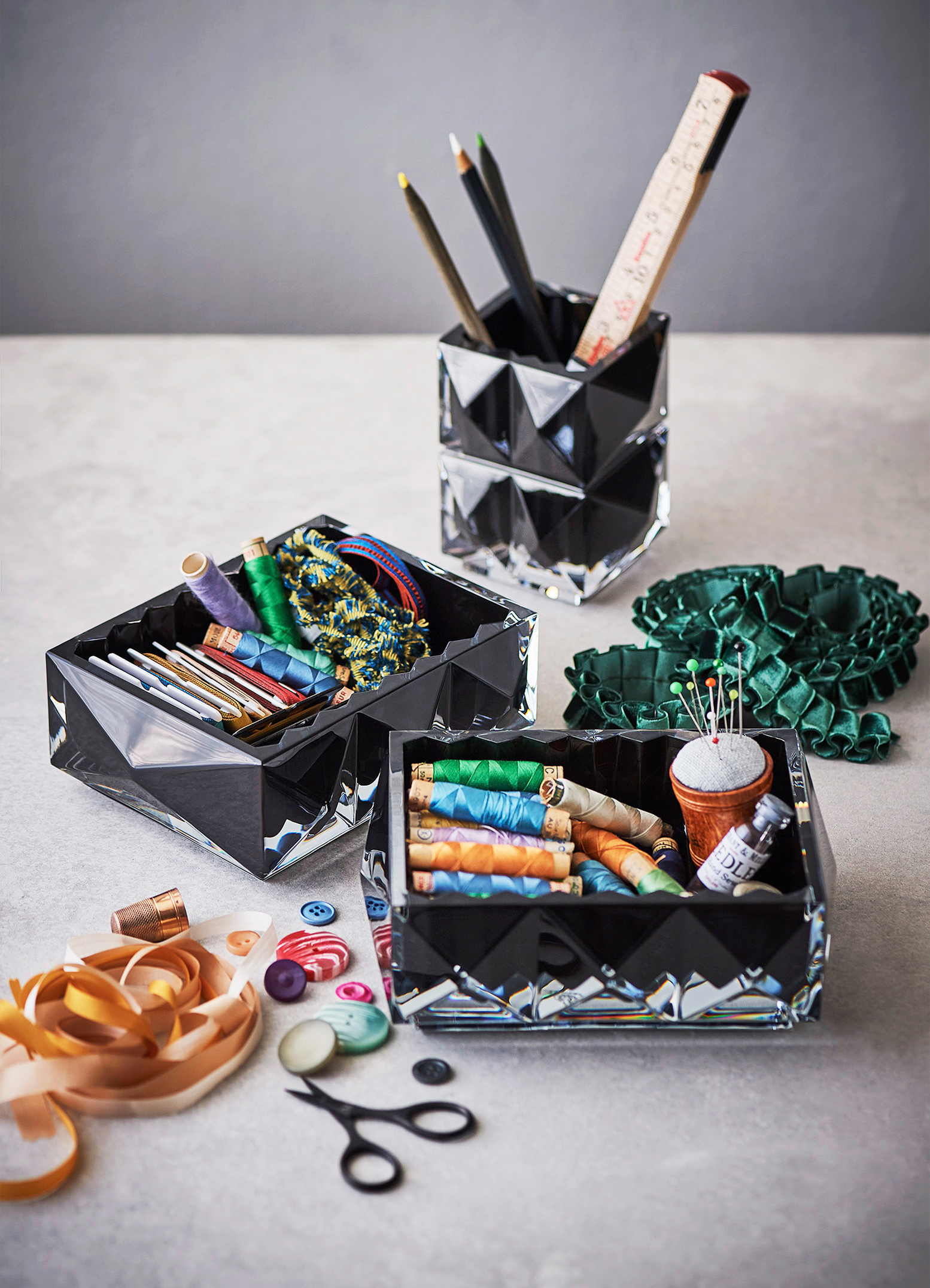 裁縫箱に見立てたのは、美しいバカラの小箱。